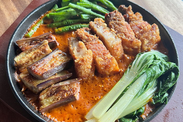 A choice of beef, or crispy pork belly, in rich peanut sauce, asian vegetables, such as bok choy, eggplant, green beans, served with shrimp paste.